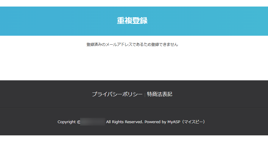 同一のメールアドレスでの登録を禁止しているシナリオでは、すでに登録済みのメールアドレスで登録しようとすると、「重複登録」のエラー画面が表示されます。