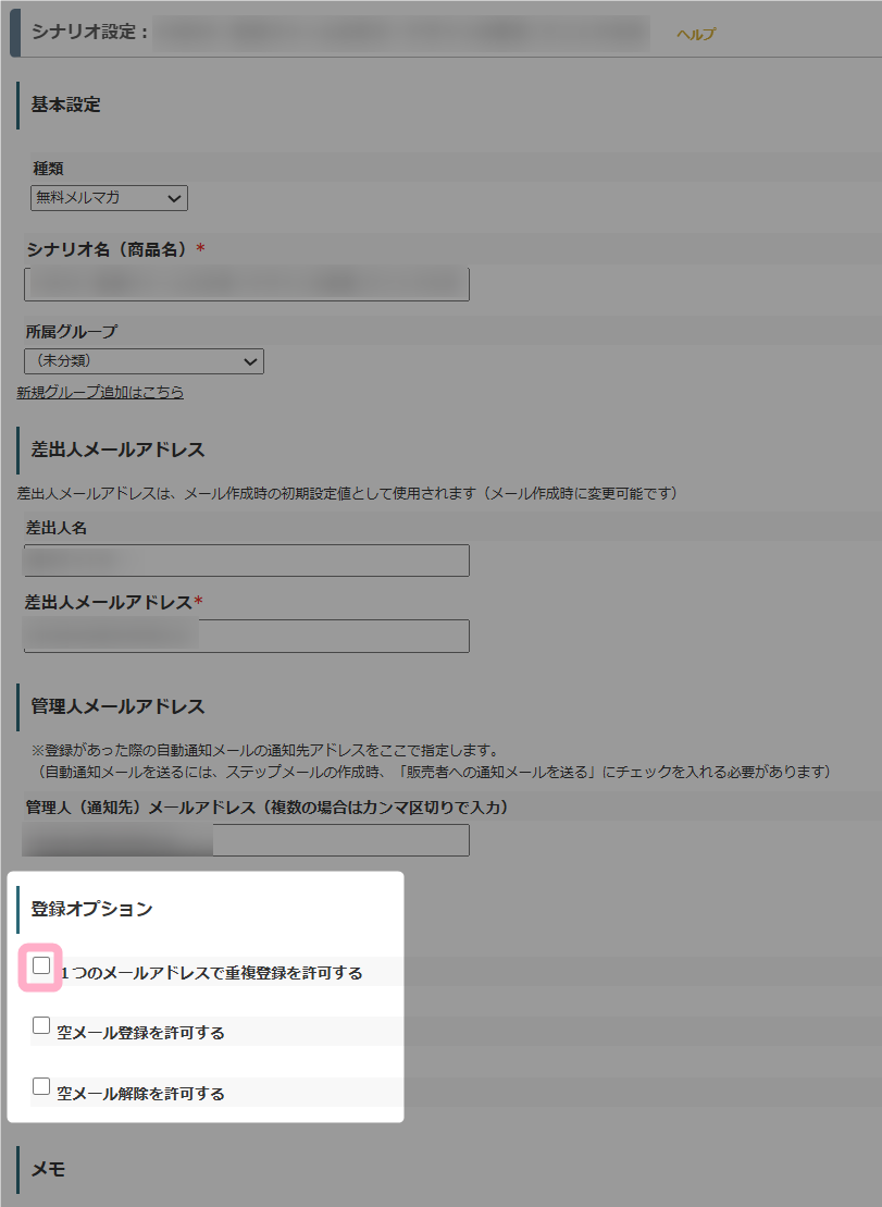 にて、「1つのメールアドレスで重複登録を許可する」のチェックを外し、同一メールアドレスでの重複登録を禁止しているシナリオでのみ表示されます。