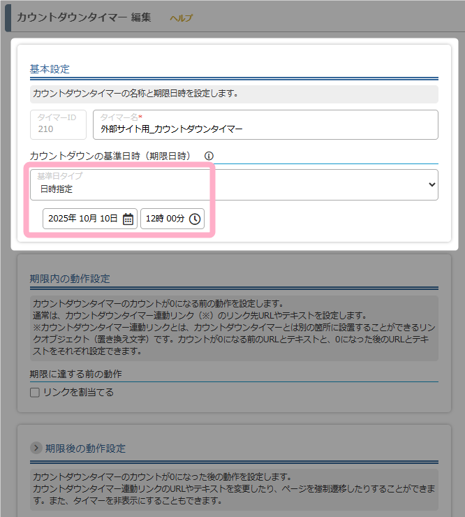 「カウントダウンタイマー編集」画面を開き、「カウントダウンの基準時間(期限日時)」より基準日タイプを「日時指定」にして、日時を指定し保存します。