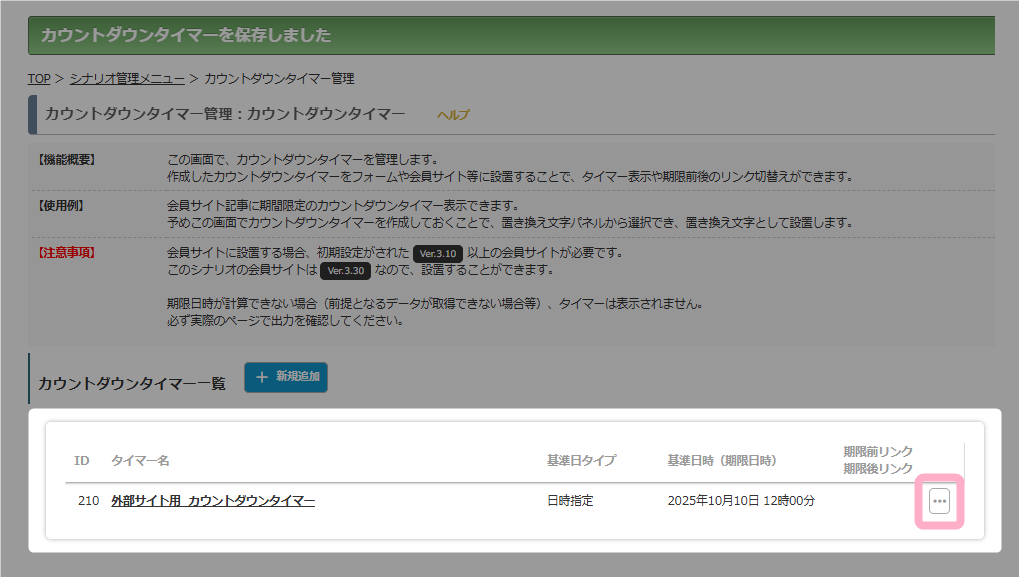 1.「カウントダウンタイマー一覧」画面で、埋め込みたいタイマー名の右側にある「…」をクリックします。