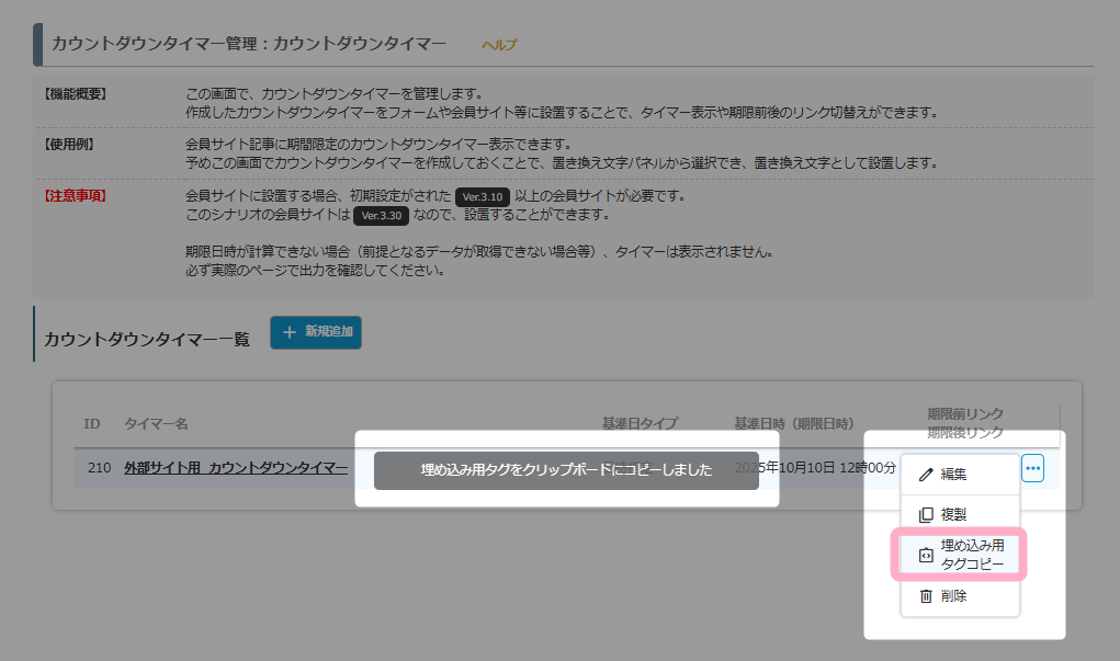 「埋め込み用タグコピー」で発行したタグは、発行した時点のカウントダウンタイマーの設定内容に応じたHTMLタグが発行されます。