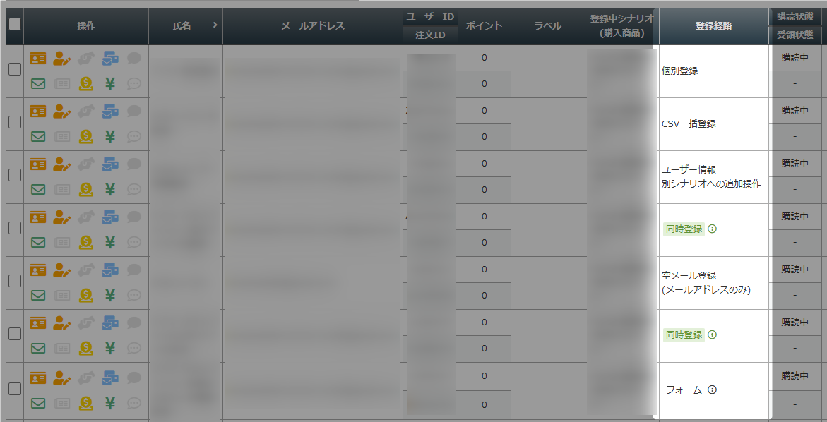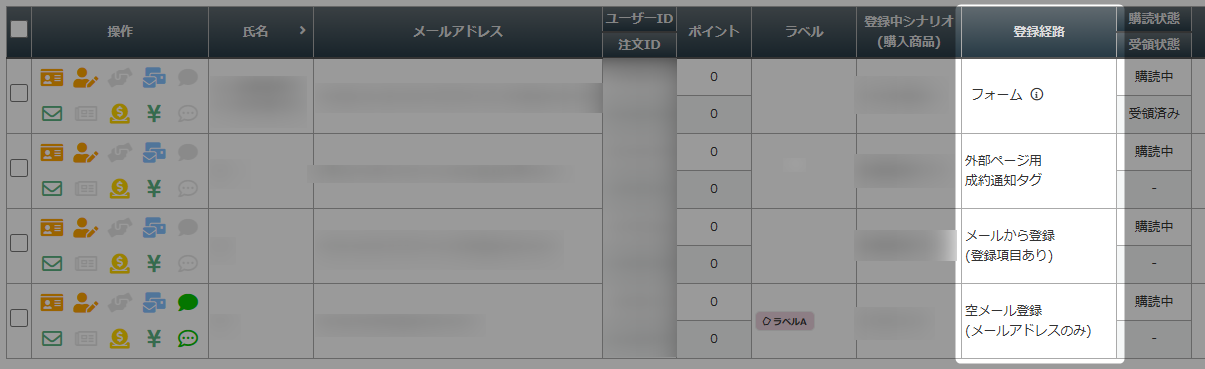 | 空メール登録(メールアドレスのみ) | 「空メール登録機能」から、確認メールなしでユーザー登録された際に表示されます。 参考:機能解説:空メール登録・解除機能 ※確認メールありの場合は、登録フォームを経由しての登録となるため、登録経路には「フォーム」と表示されます |