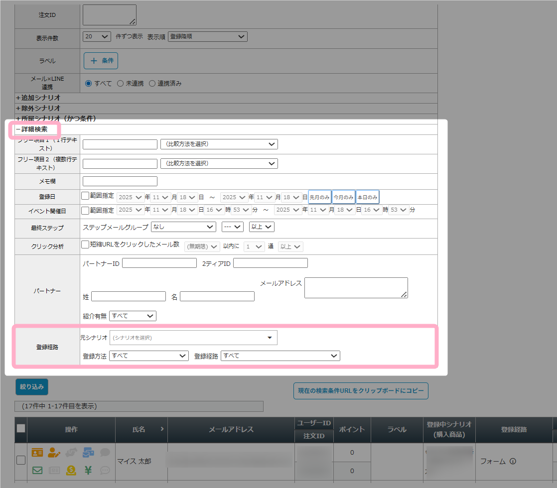 から、登録元シナリオや登録経路等からユーザーを絞り込んで確認することができます。