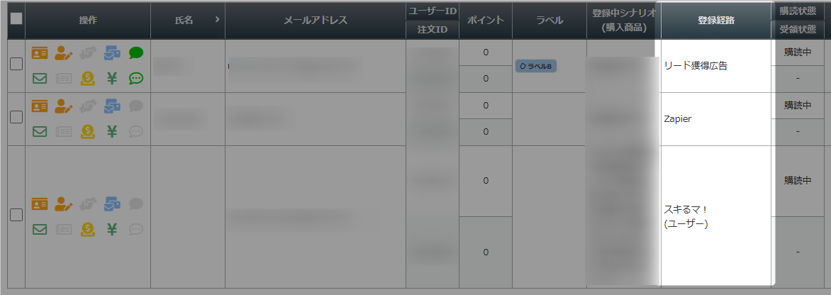 | Zapier | シナリオ管理メニュー > Zapier連携設定 を利用して、外部システムからユーザー登録された際に表示されます。 参考:MyASPとZapierの連携方法を教えてください。 |