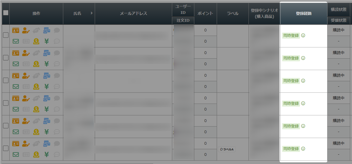 から「メルマガ配信用」シナリオに登録し1つのシナリオにユーザーを集約するように設定している場合、「メルマガ配信用」シナリオ側のユーザー一覧の登録経路には「同時登録」と表示されます。