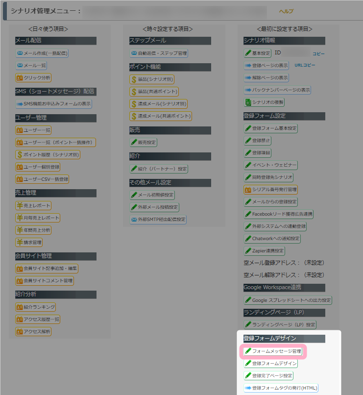 の「フォームメッセージ管理」画面では、該当シナリオの登録フォームが非公開の場合や、公開期限外にアクセスした場合等に表示されるエラー画面について、タイトルやメッセージの内容を変更することができます。