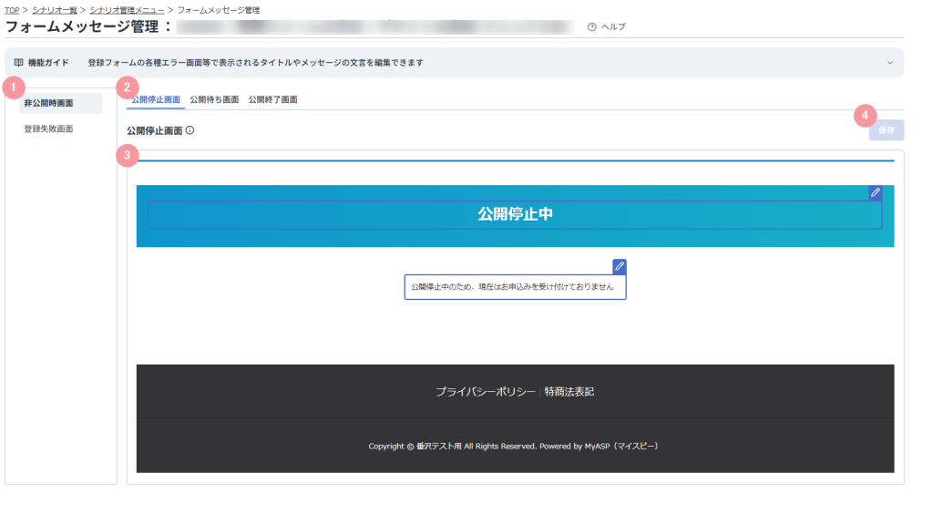 | 2 | 設定画面タブ | ※「1.左メニュー」で選択した画面によって表示が変わります 編集したいエラー画面を下記から選択します。 「非公開時画面」を選択した場合: ・公開停止画面 ・公開待ち画面 ・公開終了画面 「登録失敗画面」を選択した場合: ・申込数上限画面 ・重複登録画面 |