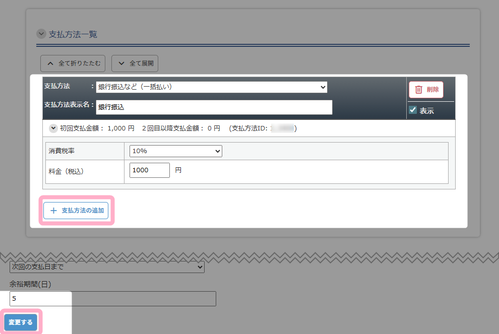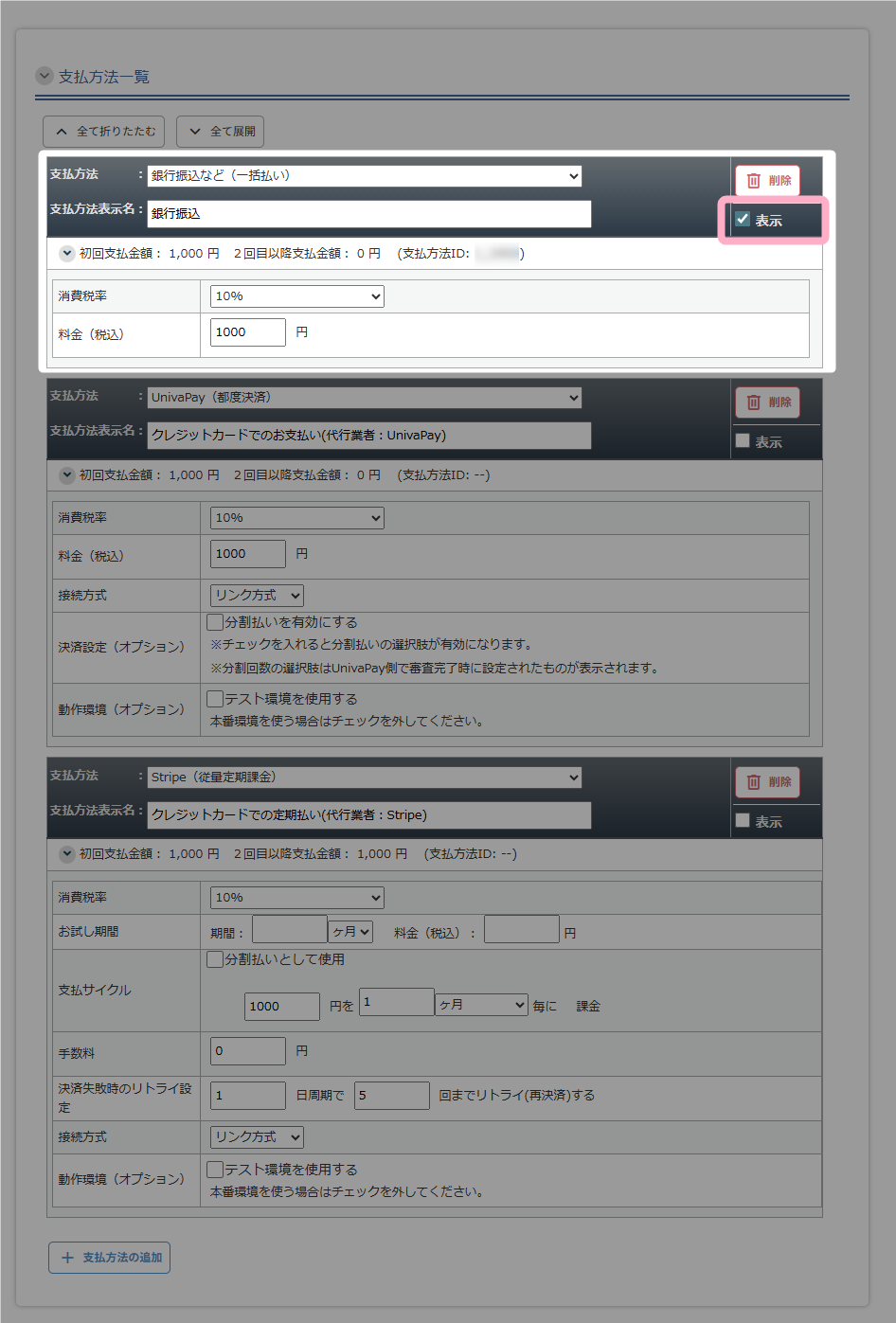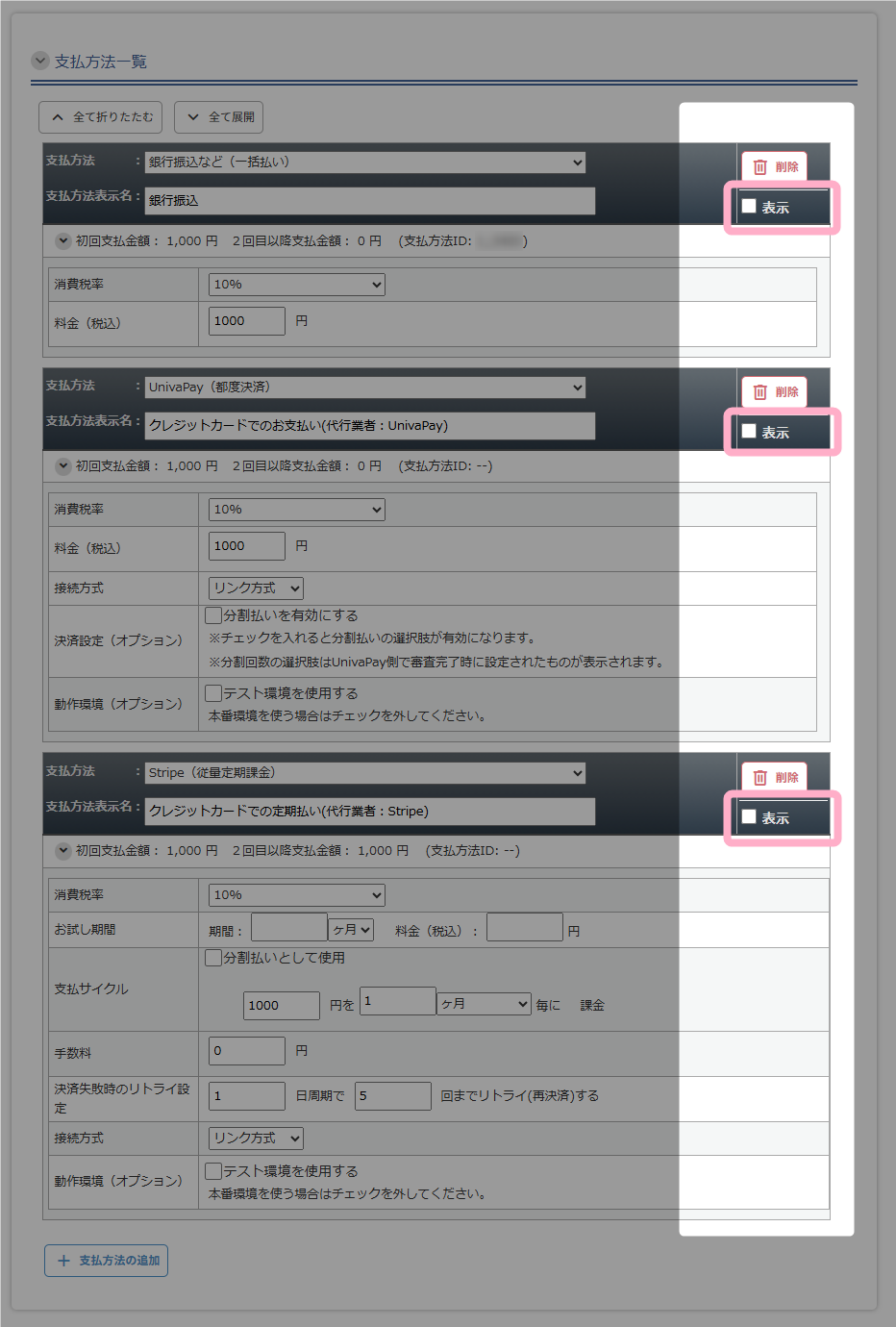 - 各お支払方法の「表示」のチェックを入れる