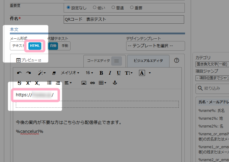 メールの本文にQRコードを表示したい場合は、URLをタグで囲まず、何も装飾していない状態のURLを本文中に直接記載したうえで、QRコード化の設定を行うことを推奨します。