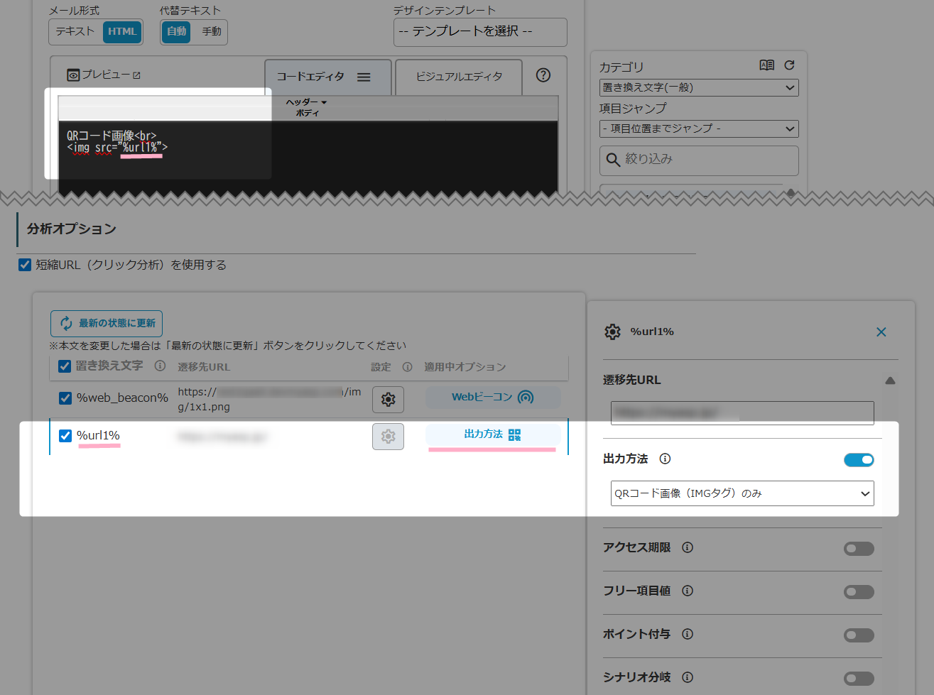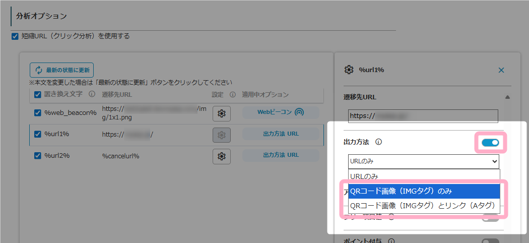3.短縮URLオプション > 出力方法 の設定で、「QR画像(IMGタグ)のみ」もしくは「QRコード画像(IMGタグ)とリンク(Aタグ)」のいずれかを選択します。
