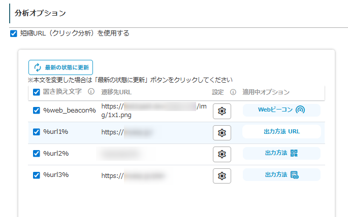 2.分析オプションの「短縮URLを使用する」にチェックを入れ、QRコードで表示したいURLの「設定」をクリックします。