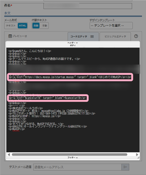 1.本文に記載したテキストやURL、配信解除リンク等の置き換え文字を選択します。