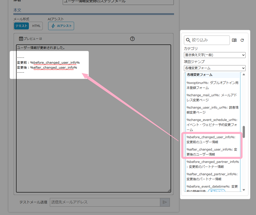 変更前のユーザー情報と変更後のユーザー情報を記載したい場合は、右側の置き換え文字パネルから「変更前のユーザー情報」と「変更後のユーザー情報」の置き換え文字を挿入し、通知メールの内容を作成してください。