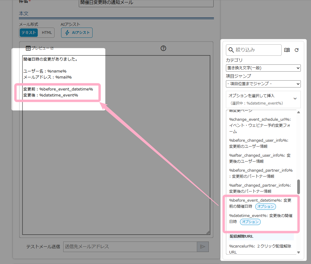 変更前の開催日時と変更後の開催日時を記載したい場合は、右側の置き換え文字パネルから「変更前の開催日時」と「変更後の開催日時」の置き換え文字を挿入し、通知メールの内容を作成してください。