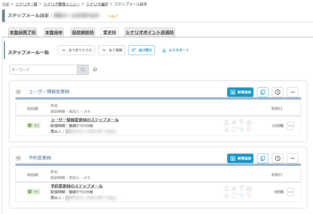 シナリオ管理メニュー > 自動返信・ステップ管理 > 変更時 タブ