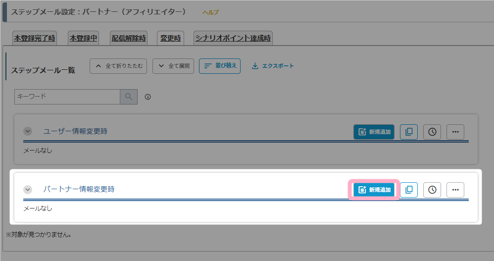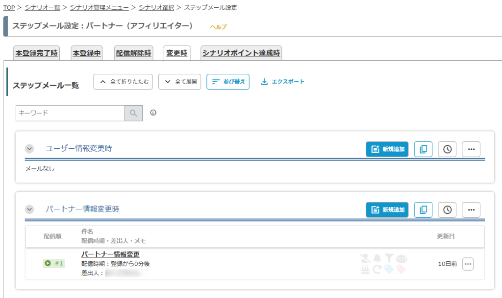 「変更時」タブの「パートナー情報変更時」にステップメールを追加します。