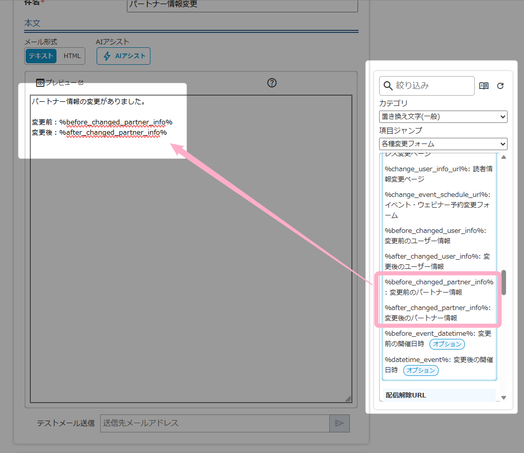 変更前のパートナー情報と変更後のパートナー情報を記載したい場合は、右側の置き換え文字パネルから「変更前のパートナー情報」と「変更後のパートナー情報」の置き換え文字を挿入し、通知メールの内容を作成してください。
