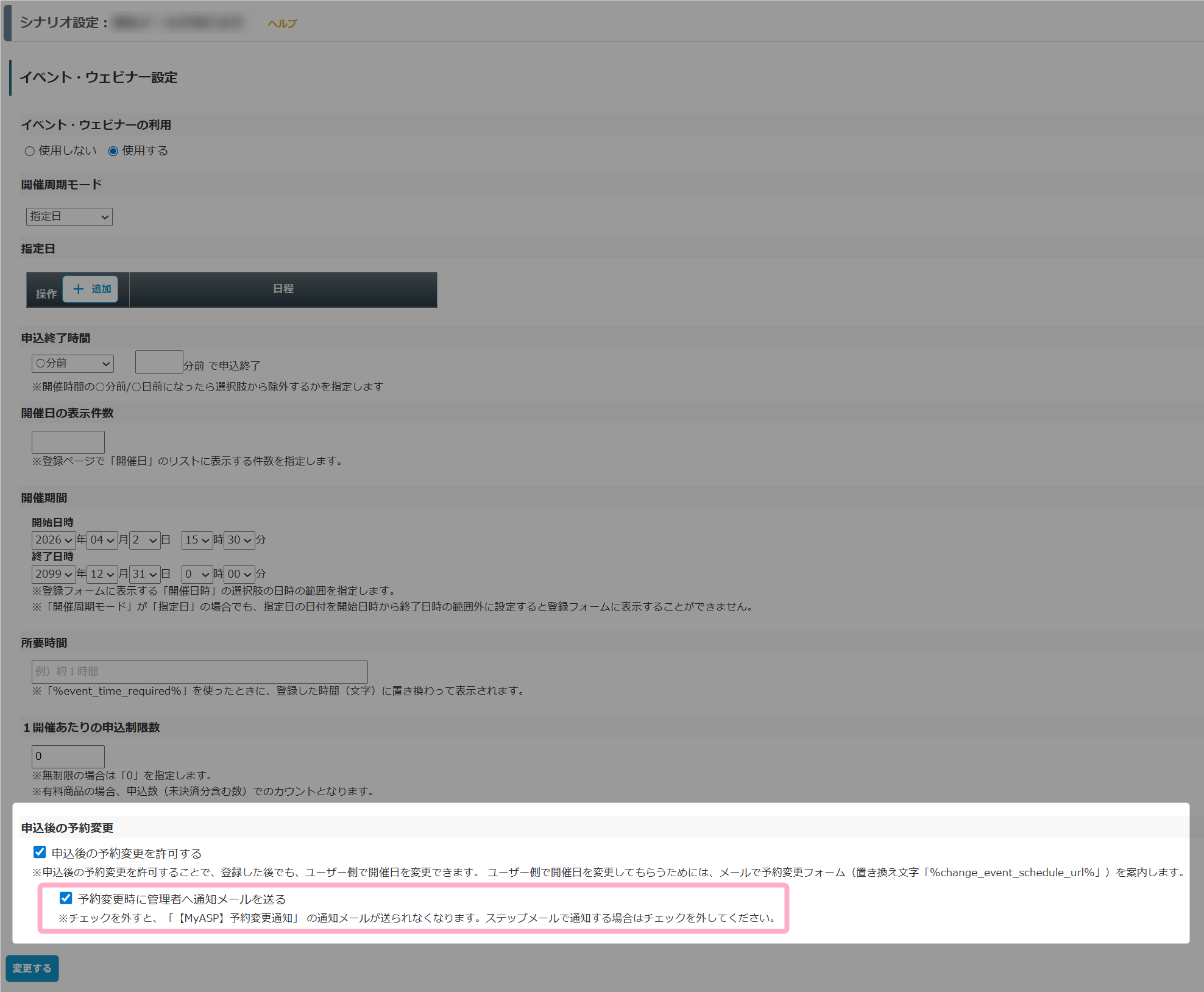 の「予約変更時に管理者へ通知メールを送る」にチェックを入れていない場合は、作成したステップメールは配信されません。