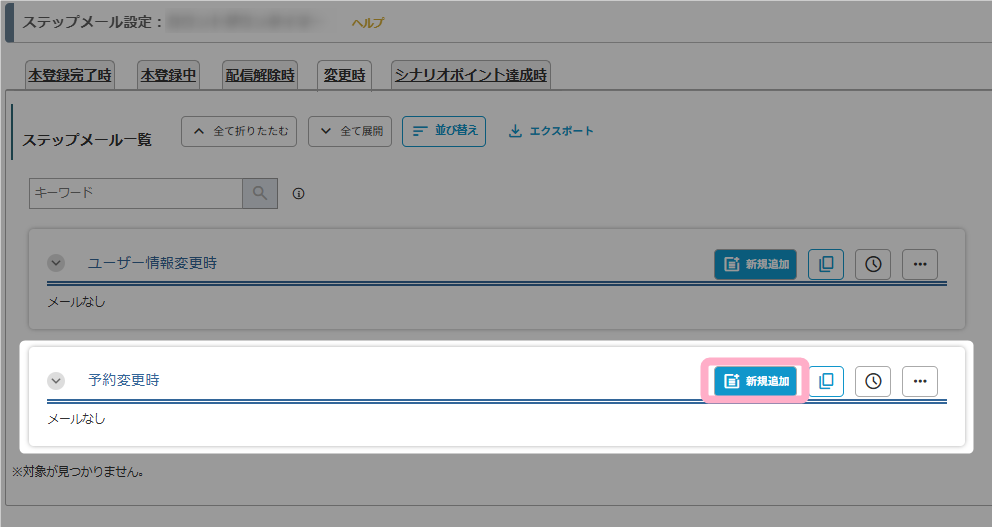 「変更時」タブの「予約変更時」にステップメールを追加します。