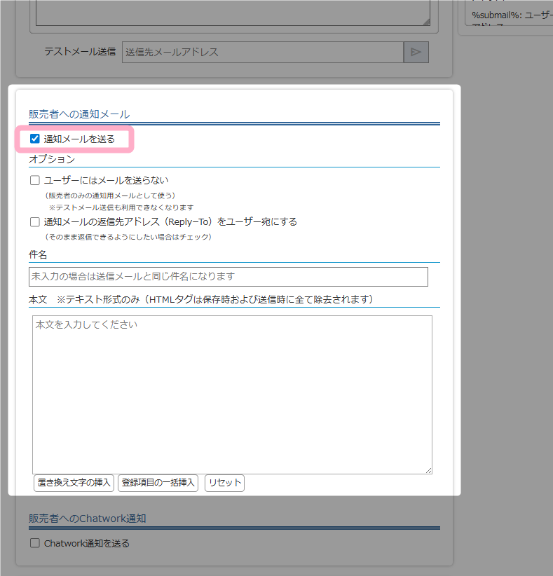 ユーザー側で情報が変更された際に販売者にも通知したい場合は、「販売者への通知メール」にチェックを入れておくことで、販売者にも通知メールを送ることができます。