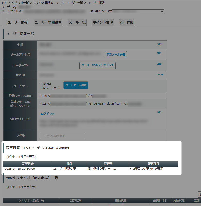 変更履歴は、ユーザー情報の「変更履歴」へ反映されます。