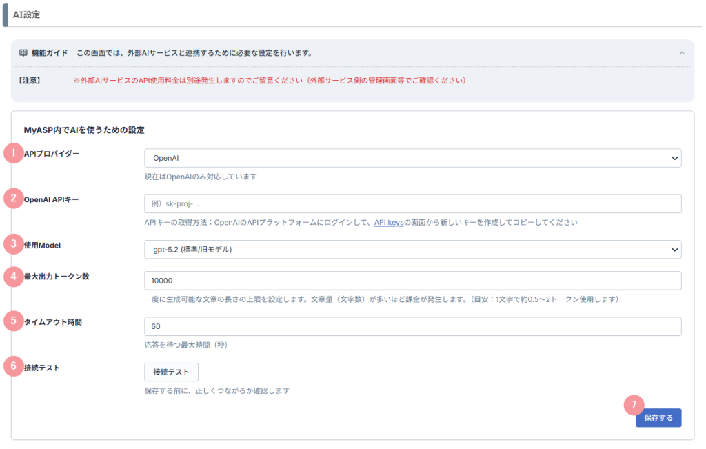 の「AI設定」画面では、MyASPでAI機能を利用するために必要な、外部AIサービスとの連携設定を行うことができます。