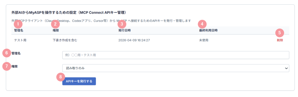 外部AIからMyASPを操作するための設定(MCP Connect APIキー管理)