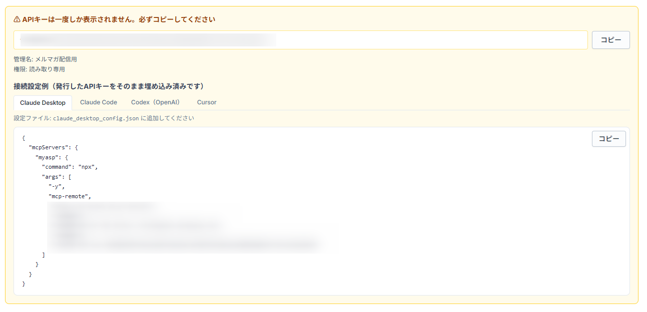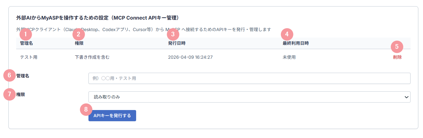 外部MCPクライアント(Claude Desktop、Codexアプリ、Cursor等)から、MyASPへ接続するためのAPIキーを発行・管理できます。