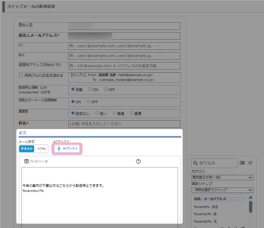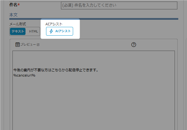 メール作成画面の本文にある「AIアシスト」機能を利用することで、AIを利用して件名と本文の下書きを作成したり、作成済みの本文を推敲して編集することができます。
