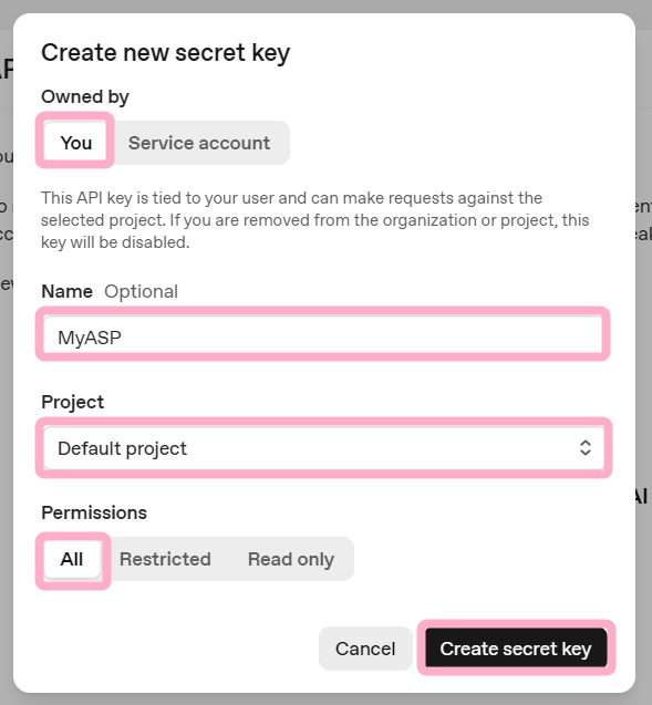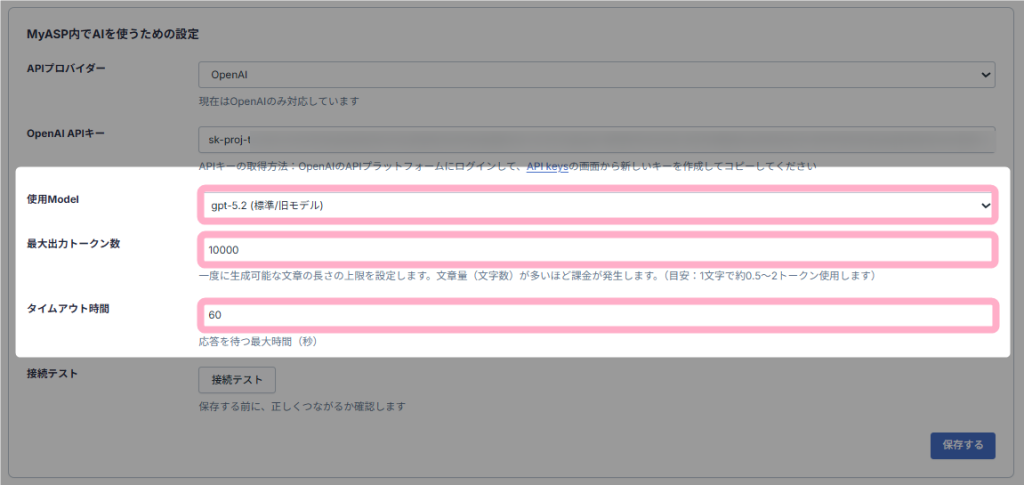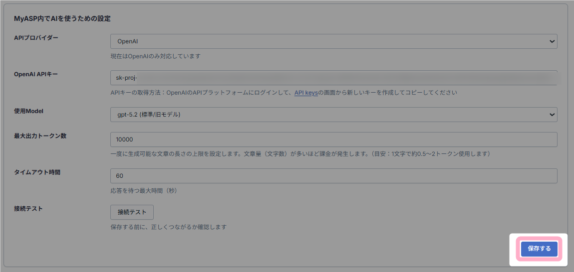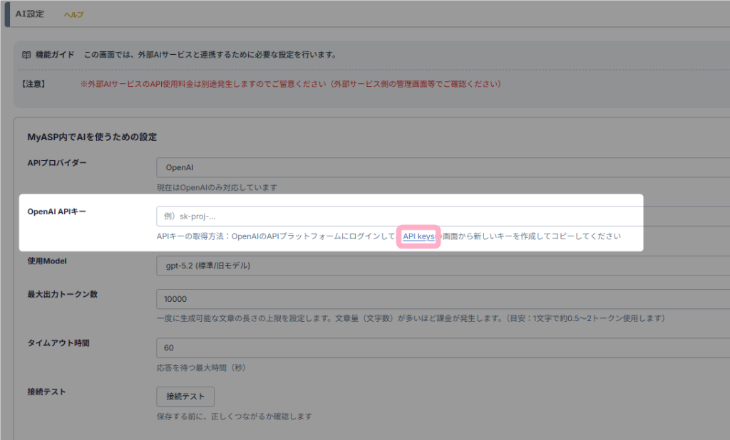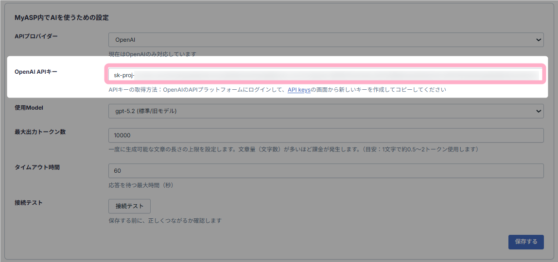 6.MyASP管理画面の「OpenAI APIキー」に(5)でコピーした値を貼り付けます。