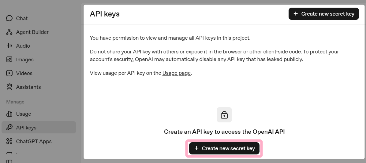 3.OpenAIのAPIプラットフォームの「API keys」画面にて、「+Create new secret key」のボタンをクリックします。