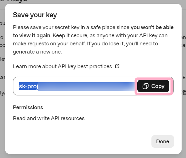 5.「Copy」ボタンをクリックして、発行されたAPIキーをコピーします。