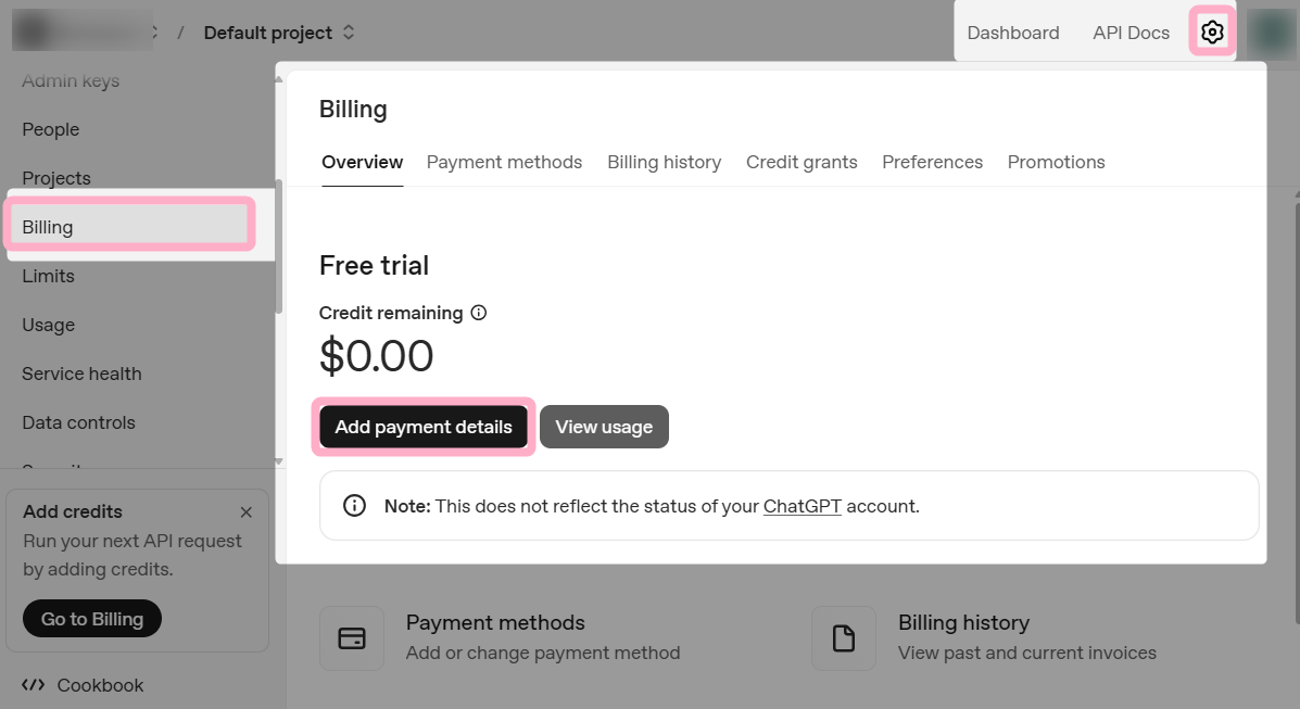 APIを使用するためには、事前にOpenAIのプラットフォーム側で支払方法の設定が必要です。