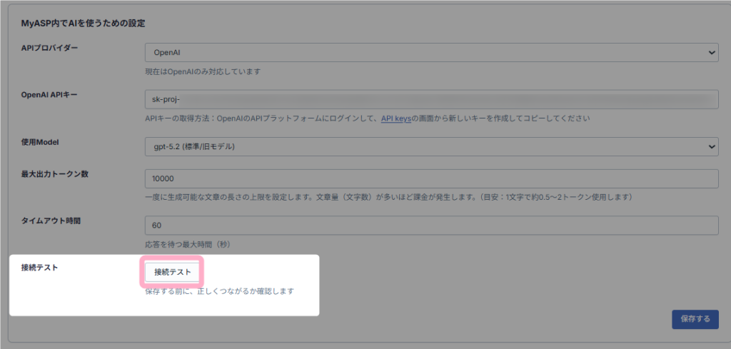 8.「接続テスト」をクリックして、外部AIサービスへ正しく接続できることを確認します。