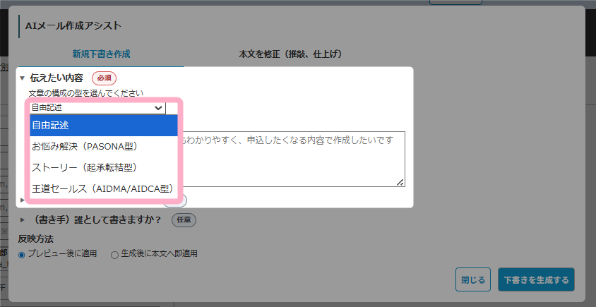 「伝えたい内容」について、以下のいずれかから構成型を選択し、メールに記載したい内容を入力します。