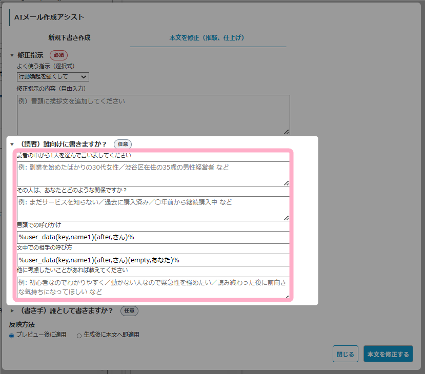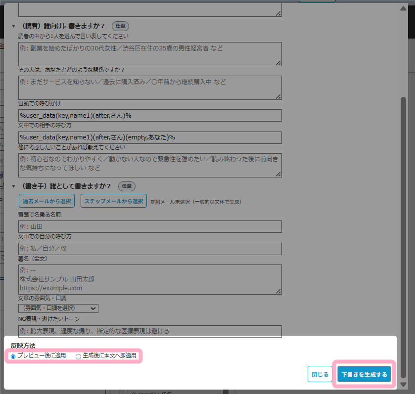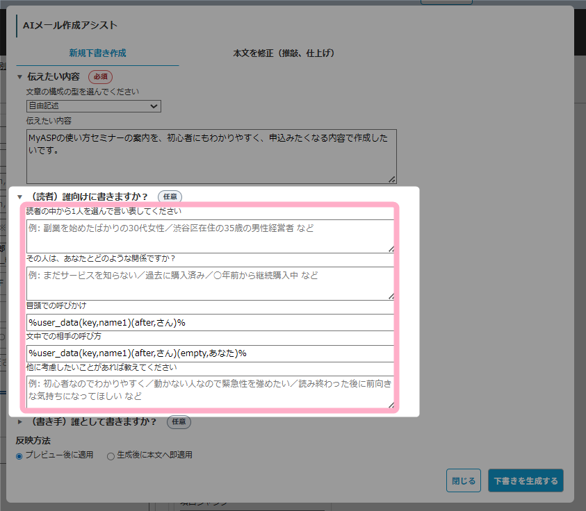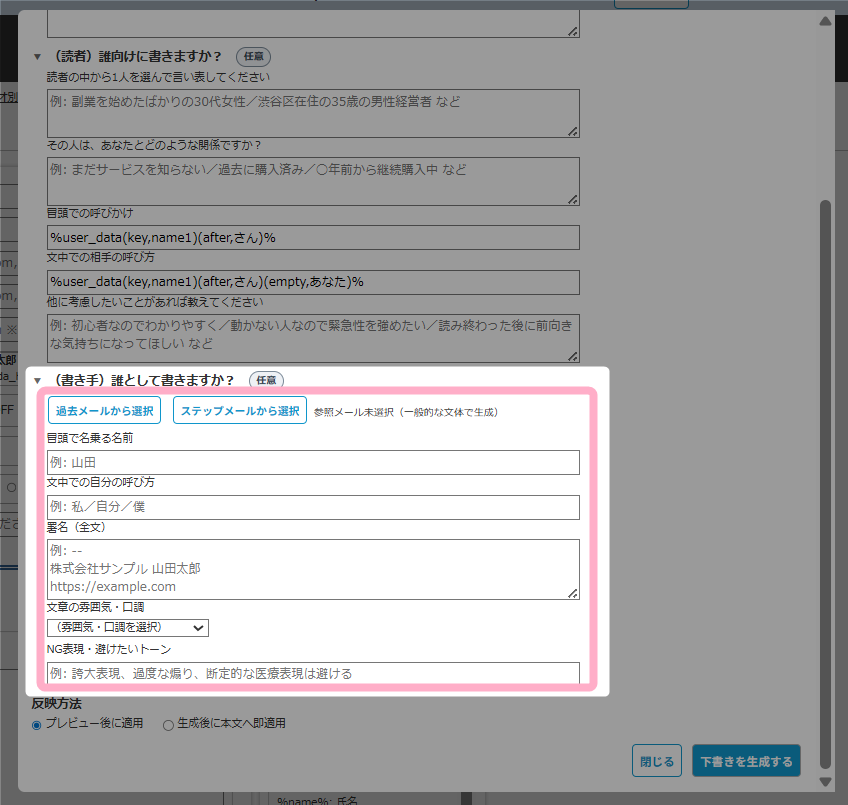 3.必要に応じて、「(読者)誰向けに書きますか?」と「(書き手)誰として書きますか?」の項目を入力します。