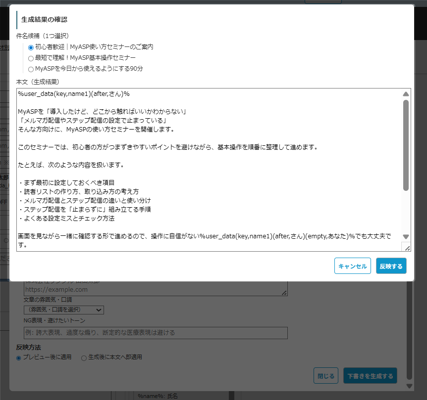 プレビュー後に反映「生成結果の確認」画面が表示され、メール作成・編集画面に反映する前に、生成した件名や本文の内容を確認できます。
