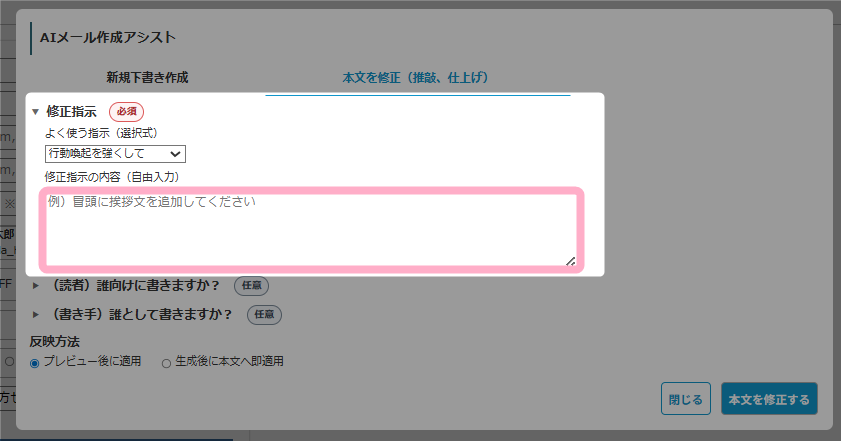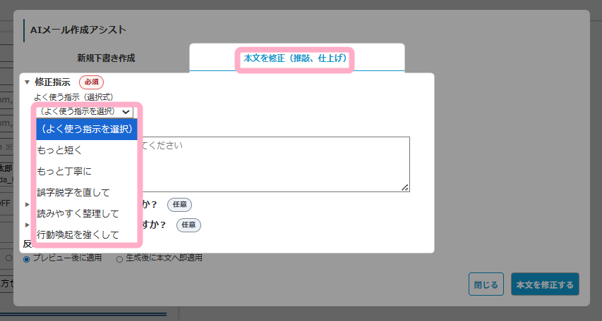 「本文を修正(推敲、仕上げ)」タブをクリックし、「修正指示」を以下のいずれかから選択します。