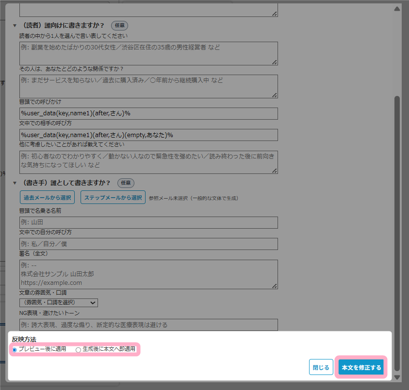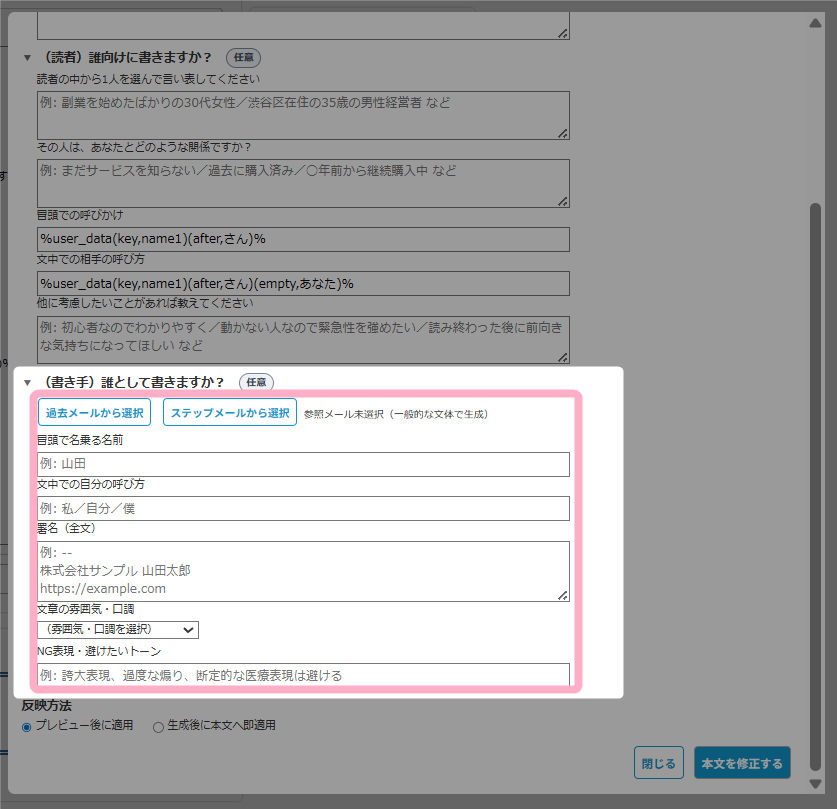 「過去メールから選択」や「ステップメールから選択」からメールを選択することで、選択したメールを自動で参照して書き手の情報を記載することもできます。