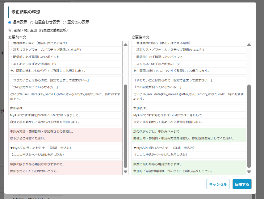 プレビュー後に反映「修正結果の確認」画面が表示され、メール作成・編集画面に反映する前に、変更前と変更後の本文を比較して確認できます。