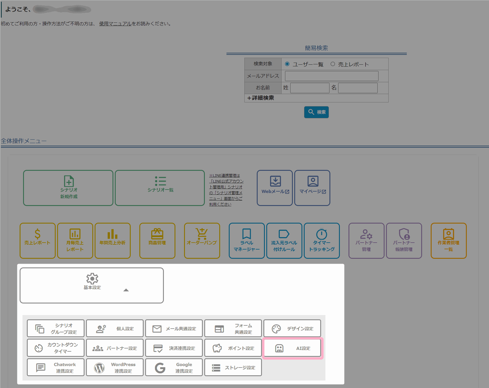 1.MyASPトップ画面 > 基本設定 >AI設定 をクリックします。