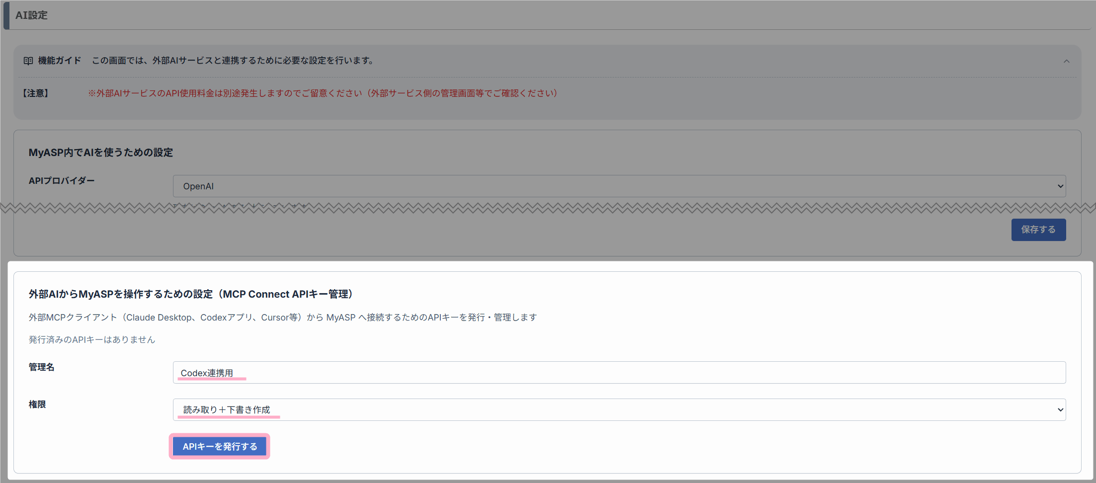 2.外部AIからMyASPを操作するための設定(MCP Connect APIキー管理)にて、以下の内容を入力・選択し、『APIキーを発行する』をクリックします。