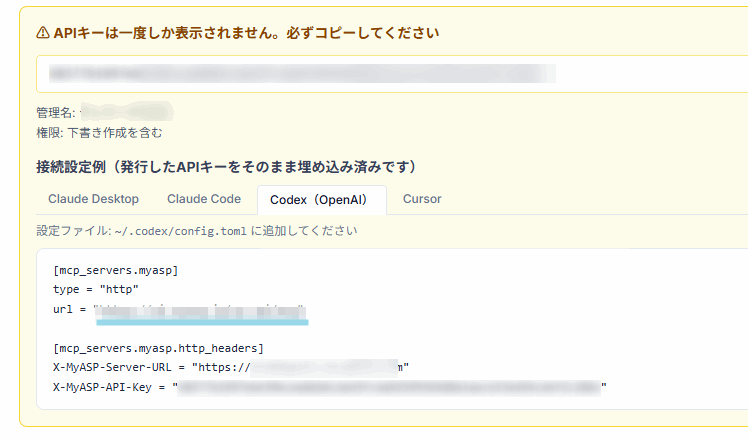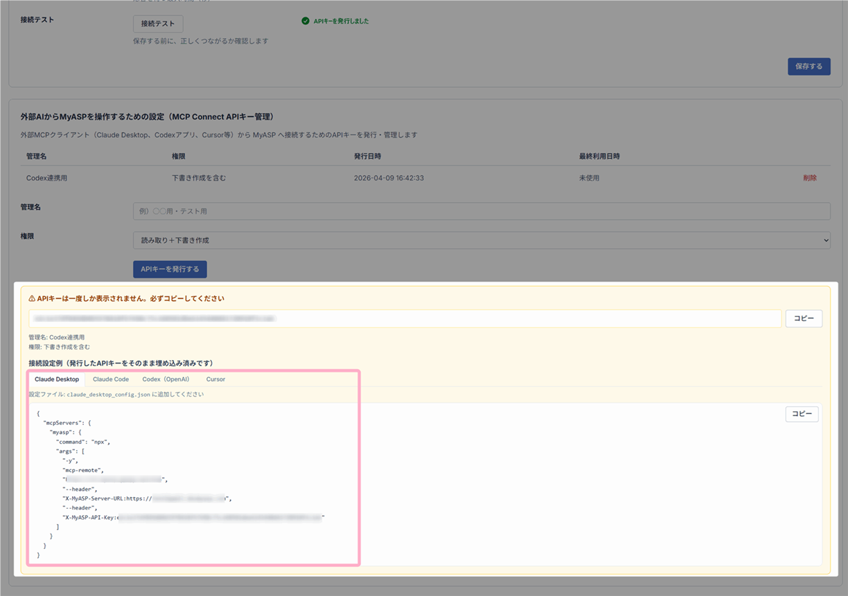 本記事では、MyASPでAPIキーを発行する方法と、Codex、Claude Desktop、Claude Code、Cursor で「MyASP MCP Connect」に連携する方法を説明します。