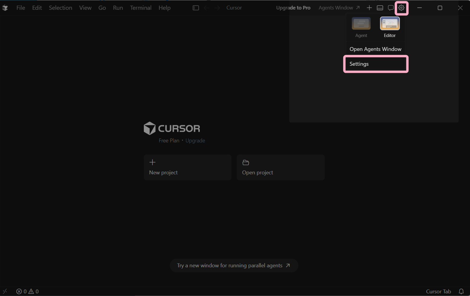 1.Cursor の右上にある 歯車アイコン > Settings をクリックします。