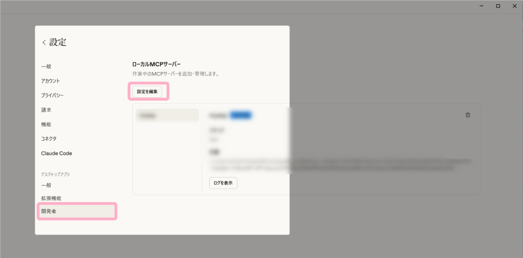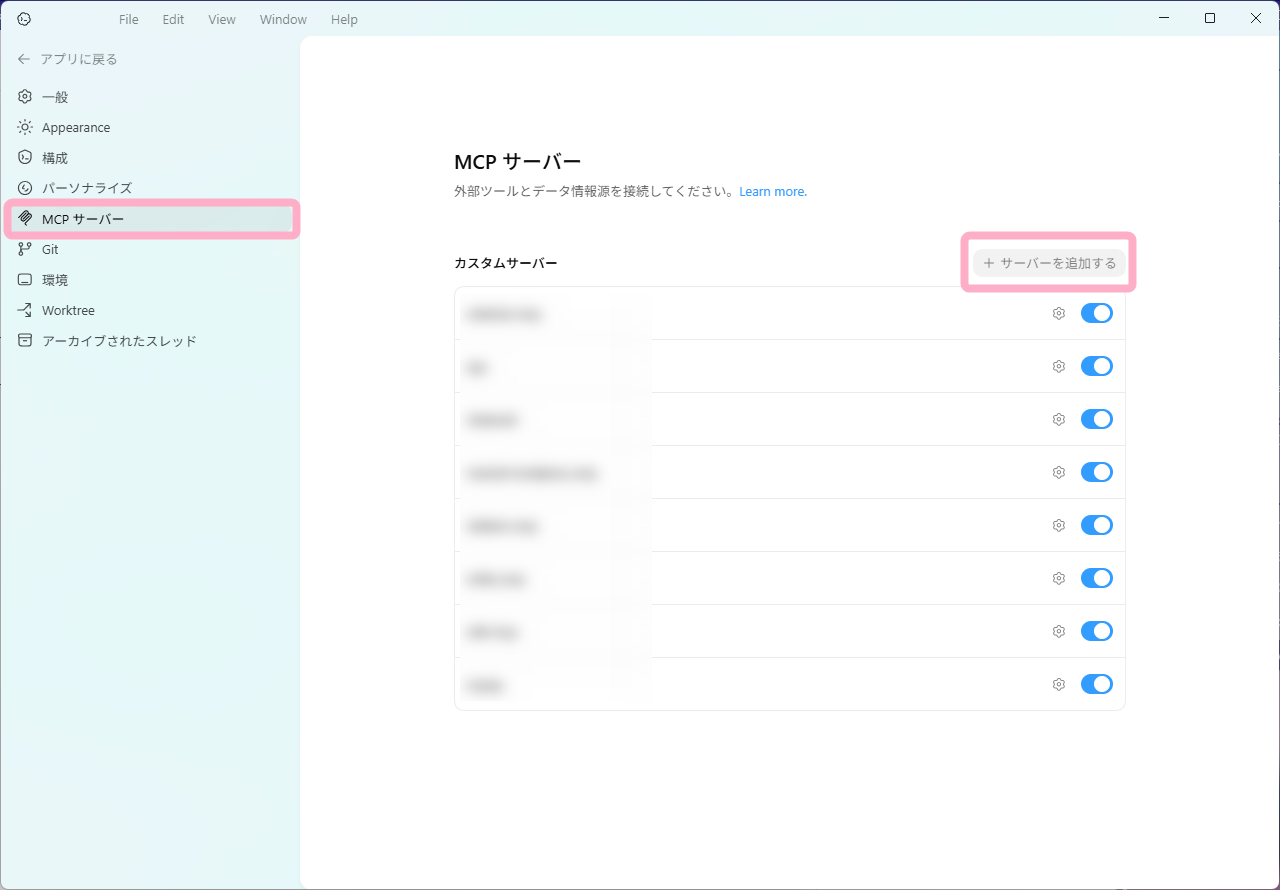 2.「MCPサーバー」を選択し、『+サーバーを追加する』をクリックします。