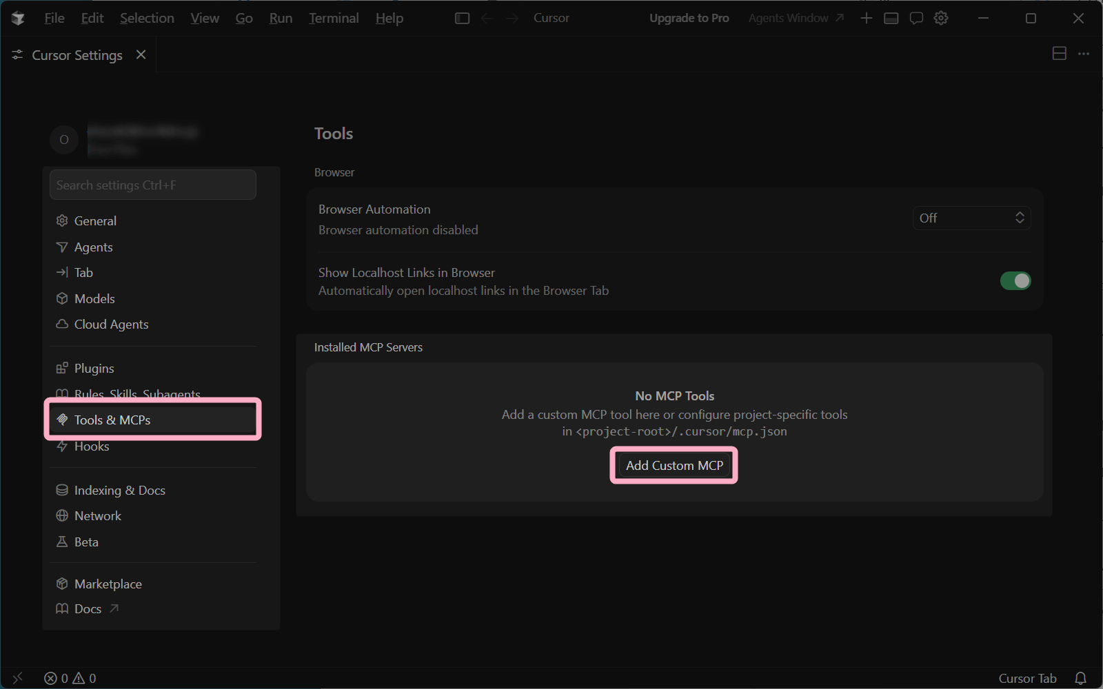 2.「Tools & MCPs」を選択し、『+Add Custom MCP』をクリックします。
