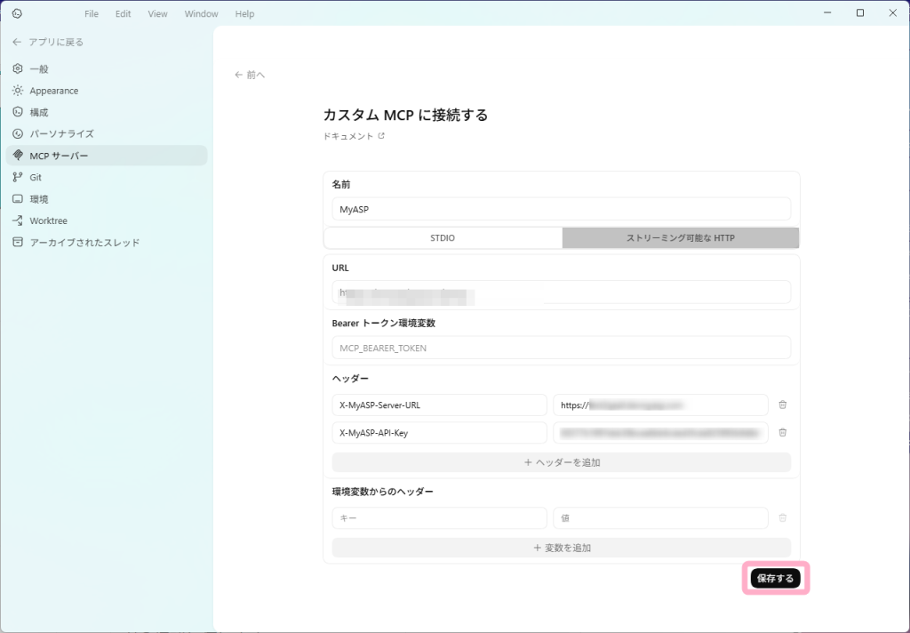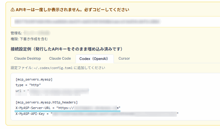 | MCPサーバーURL | MyASP のMCPサーバーURL |