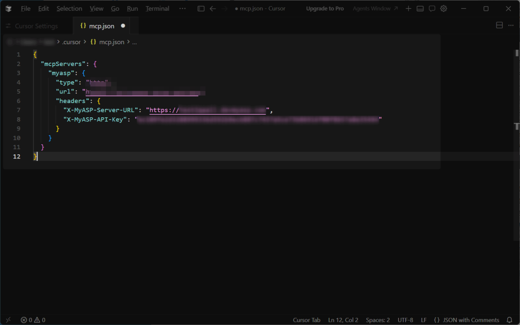 3.開いた「mcp.json」にMyASP管理画面上で発行したCursor用の接続設定を入力します。