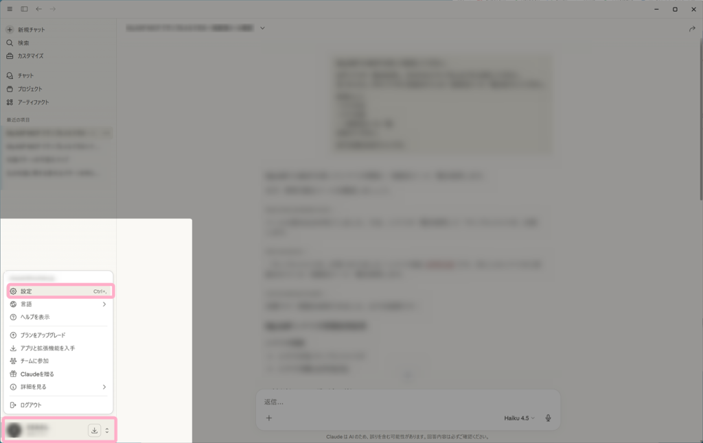 2.Claude Desktop の左下から、「設定」をクリックします。