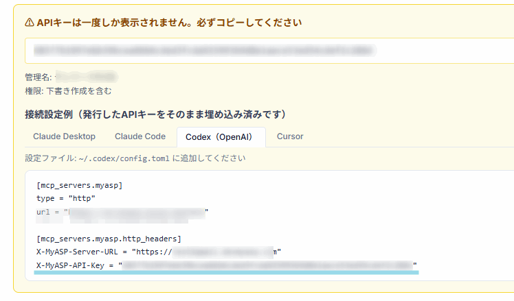 X-MyASP-Server-URLが正しいサーバーURLになっているか確認するX-MyASP-API-Keyが正しいか確認する- AIツールを再起動して再度試す